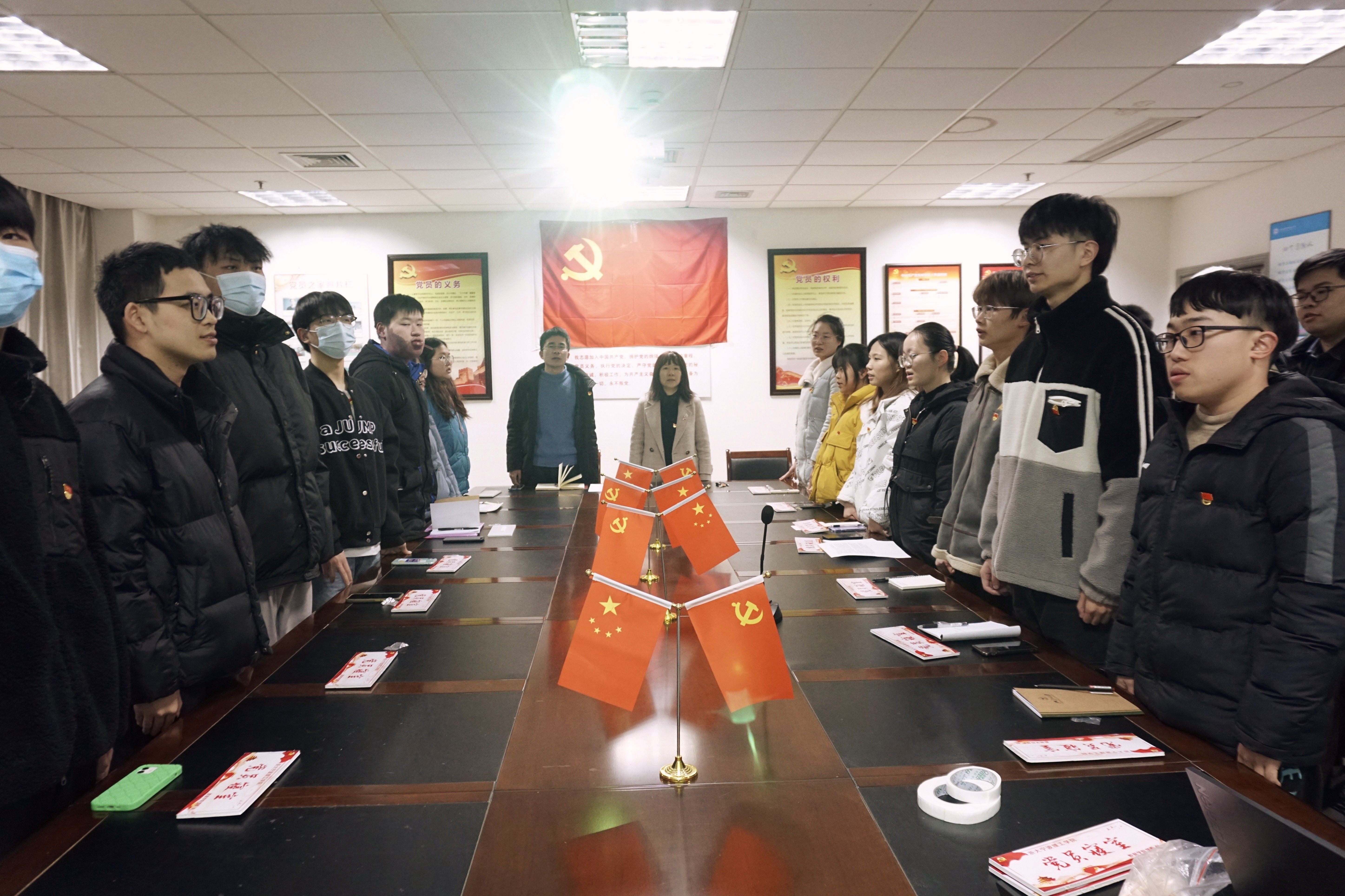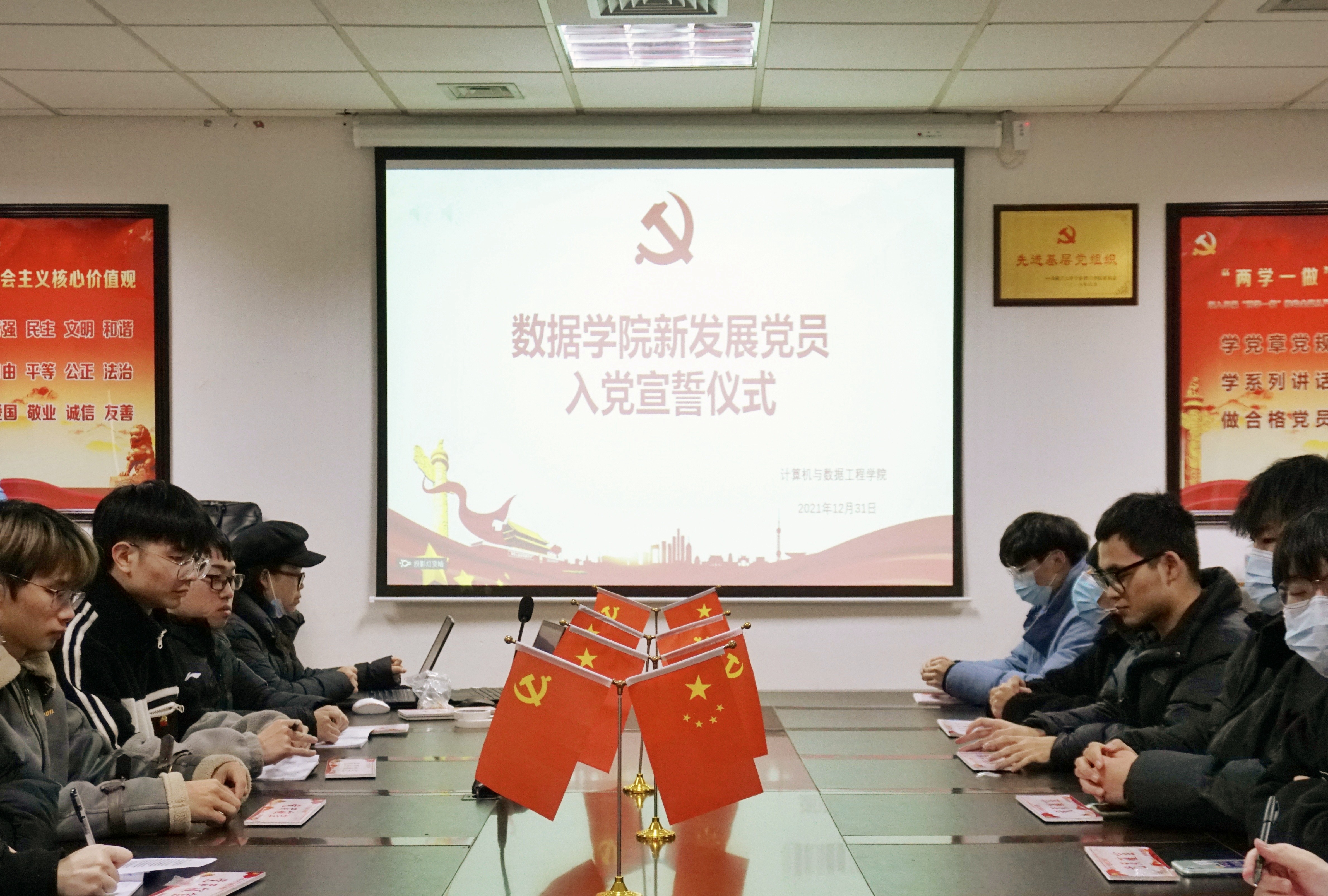 数据学院于12月31日下午在党员之家举行新发展党员入党宣誓仪式。学院党委组织委员、计算机学生党支部书记王常青老师主持会议,数据学生党支部书记马炜栋老师领誓,全体新发展党员参加。