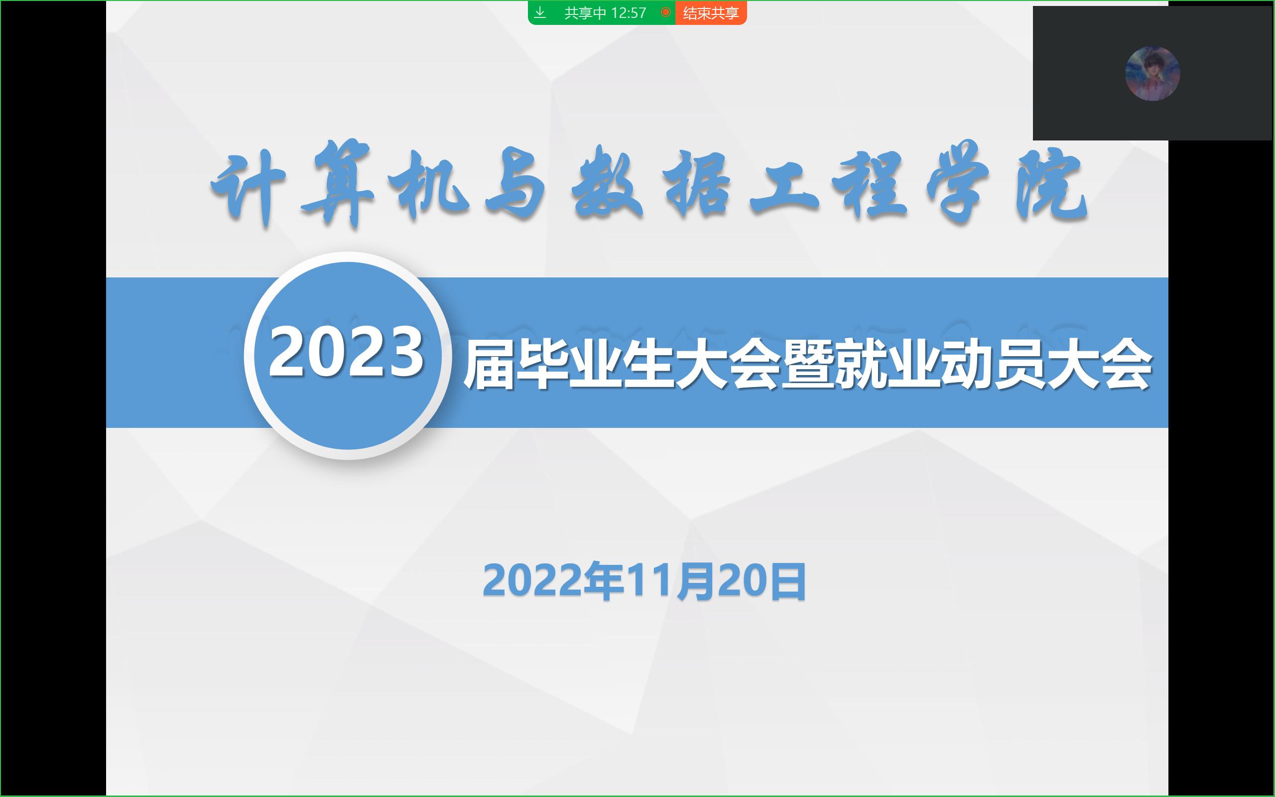 为深入贯彻落实党的二十大精神,全面推进2023届毕业生就业工作,数据学院于11月18日中午在石麟大楼602会议室召开2023届毕业班班导师会议,并于11月20日下午召开了2023届毕业生大会暨就业动员大会。学院党委副书记汪洪、计算机研究所书记郭新友、数据研究所所长舒振宇、教学主管李书芹、校团委老师梅呈龙、2023届毕业班班导师和全体本科毕业生参加会议,会议由学院思政副主管黄梦迪主持。