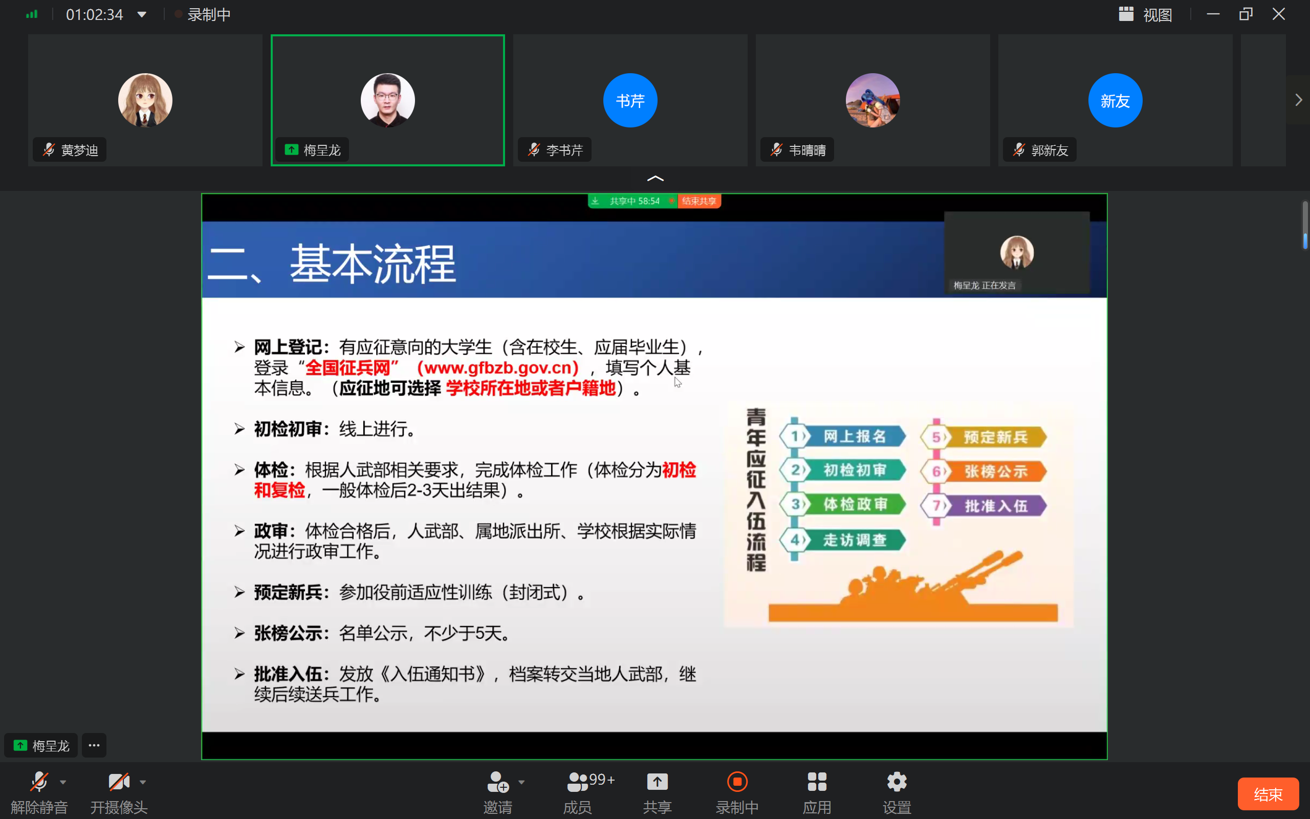 梅呈龙老师就毕业生征兵入伍相关政策进行了宣讲,重点为毕业生们讲解了目前国家在入伍大学生考研、就业、学费减免方面的支持政策,鼓励有志于参军入伍的大学生积极踊跃报名,抓住人生中的重要机会,圆一个军人梦。