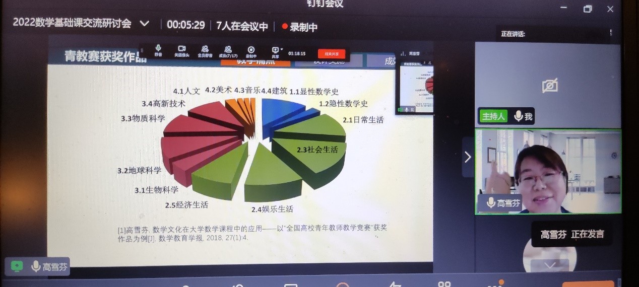 会上,胡良根教授以“数学教师的科教融合发展的思考”为题,从培育学生数学素养、教学融合科研及教学科研平衡互促发展三个方面,分享了宁波大学数学与统计学院的工作思路和成绩。高雪芬教授以“大学数学基础课程教学创新设计与实践”为题作报告,从基础数学教学的痛点、教学设计及持续改进等方面对基础数学课程教学中的创新设计与实践环节做了详细的阐述和总结,分享经验。