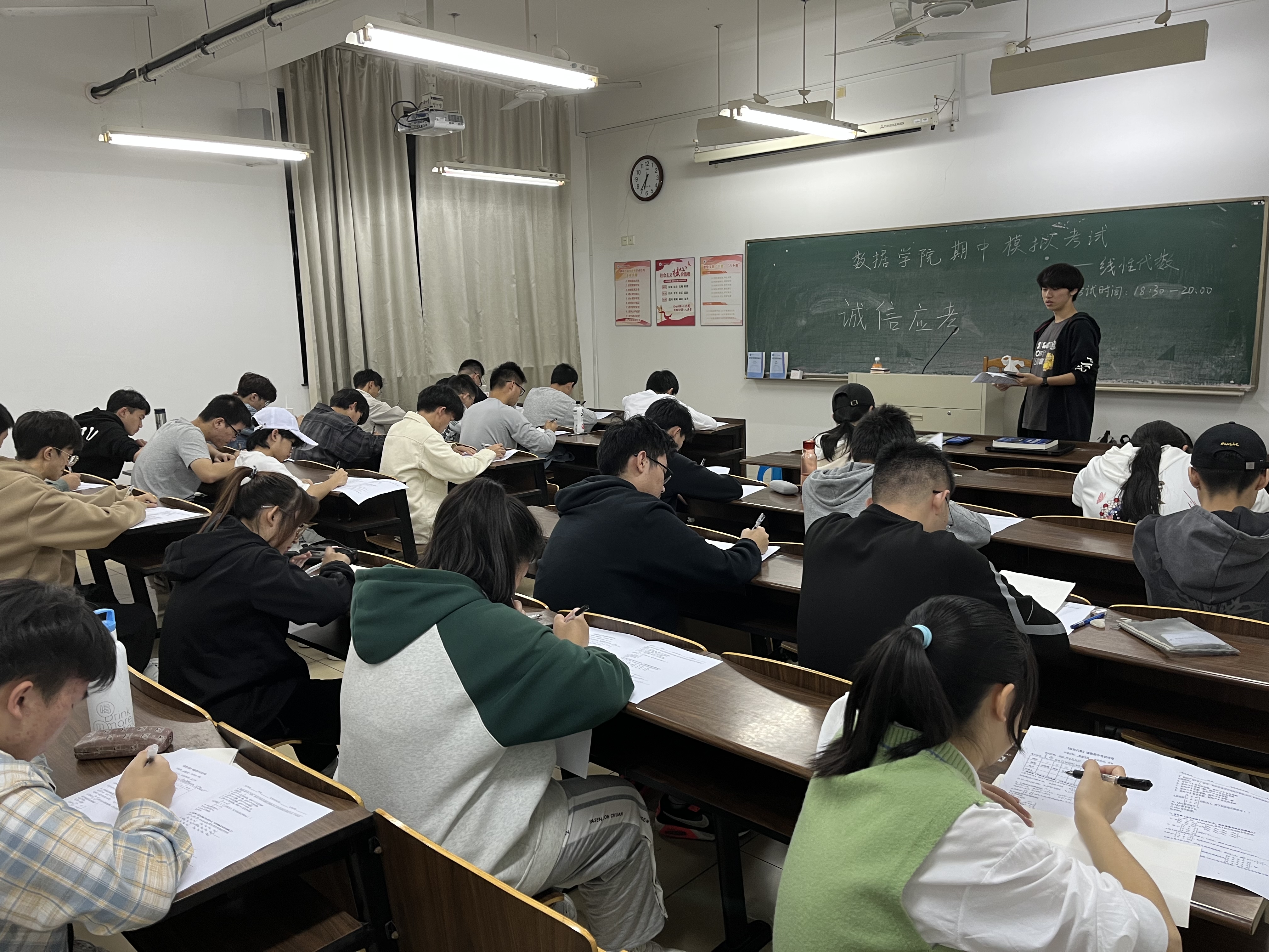 为了帮助数据学院新生更好地适应学习生活,同时营造一个全真的期中考试氛围,帮助同学们更好的迎战线性代数和微积分期中考试,检验学习成效,督促认真备考,学院分别在10月30日和11月6日晚6点半,利用晚自习时间举行了线性代数和微积分期中模拟考试,全体新生按时参加了此次模拟考试,由新生班助担任监考老师,负责学院学风建设工作的辅导员邓老师在考试期间巡考。