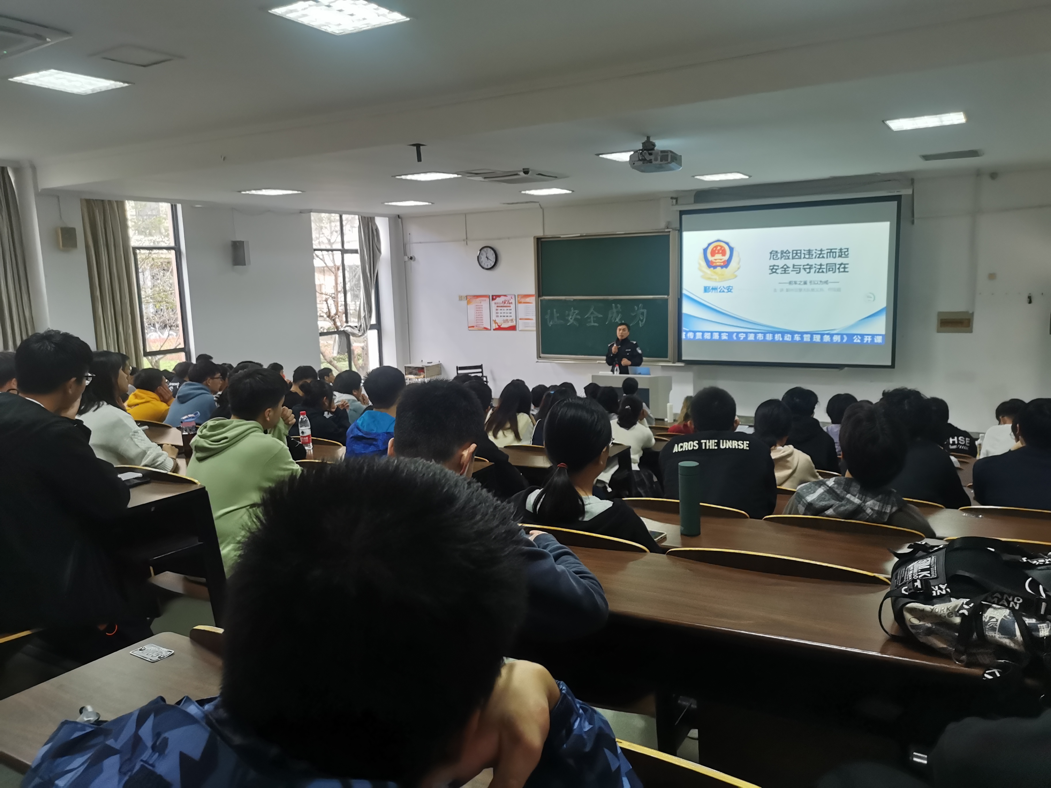 为进一步加强学生交通安全教育,提高学生交通安全意识,营造良好的平安校园氛围,保卫处特邀请宁波市公安局交通警察局鄞州大队首南中队杨义兵和何佳超两位交警同志来校为学生开展交通安全专题讲座。保卫处副处长陈恩、保卫处副主管冯财杰、数据学院党委副书记、纪委书记汪洪和100余名学生代表参加讲座。本次讲座由数据学院承办,由思政主管王常青主持。