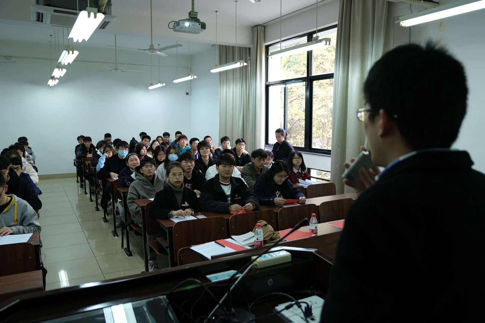开班典礼后,夏文来老师作团校第一讲。他以“战疫情,中国为什么能赢”为题,从工业体系、民族情感、处事态度等三个方面分析了中国战疫取得成功的原因。他引导团学干部正确理解中国共青团的属性和定位,指出了团学组织的先进性和群众性,同时希望大家处理好时代变化、祖国发展和个人奋斗的关系。课程尾声,夏老师声情并茂地讲述了我校青年学子奔赴新疆、奉献青春的动人故事,同学们深受鼓舞,现场掌声雷动。
