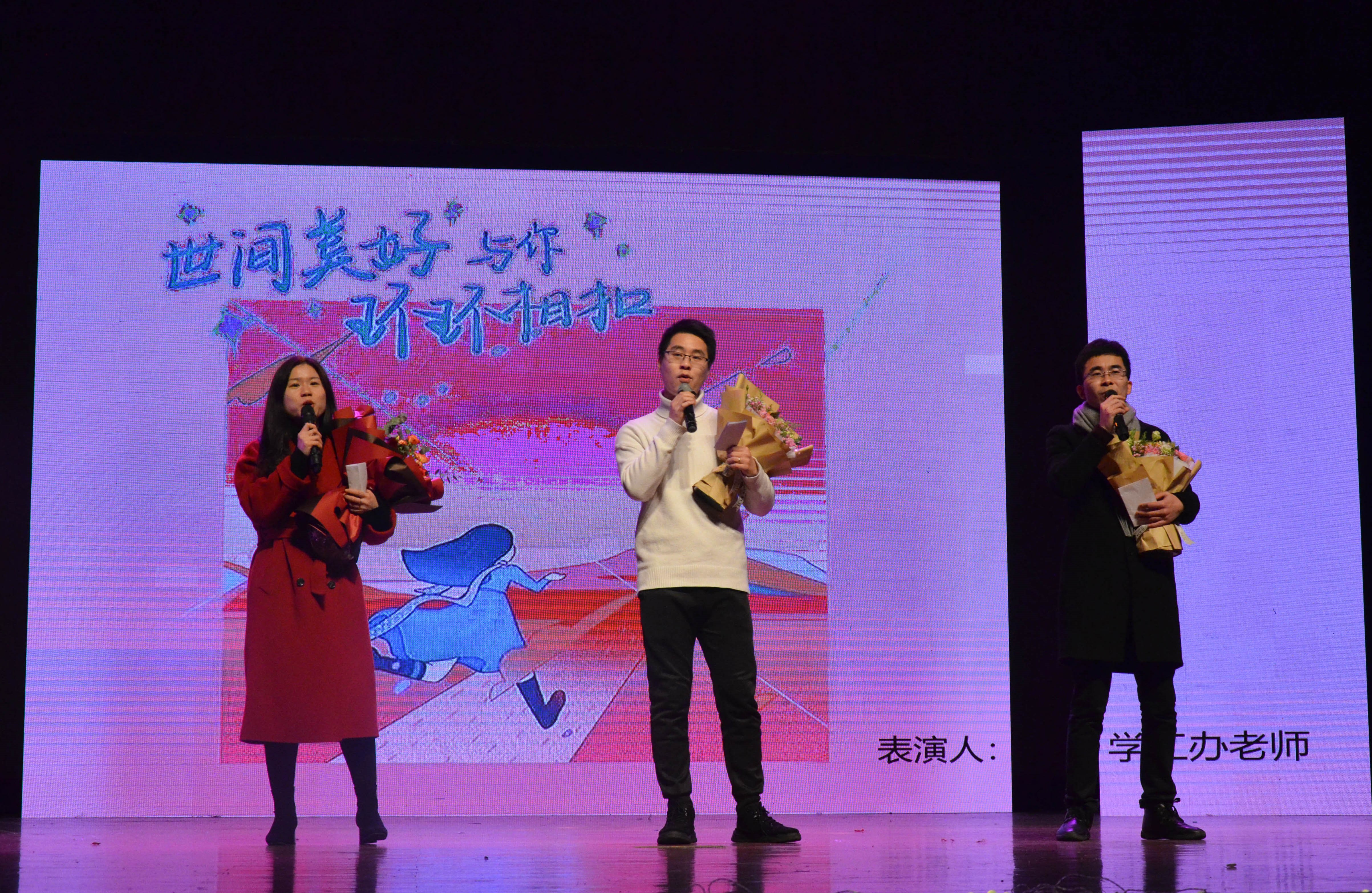 迎新晚会在蓝窗海乐队激情澎湃的歌声里拉开序幕,点燃了在线观众的热情。本次晚会表演形式多样,舞蹈、音乐、器乐表演和舞台剧一应俱全。舞蹈队队员欢快的舞姿、戏曲社成员悠扬的曲调、音乐协会成员动听的旋律、器乐团组员铿锵的演奏,收获了一大波微信墙的互动弹幕。班级舞台剧和班助寄语也让大家感受到冬日的温暖。最后神秘嘉宾的倾情献唱,来自学工办老师的《世界美好与你环环相扣》将晚会的气氛推向了高潮!