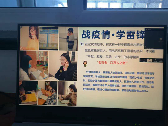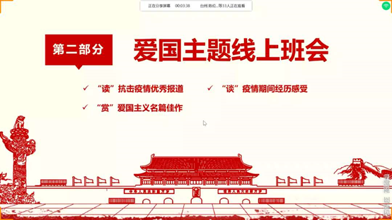 学院组织各班级开展以“奋斗的我,最美的国”为主题的线上班会。通过“读”抗击疫情优秀报道、“赏”爱国主义名篇佳作、“谈”疫情期间经历感受等多种形式,表达团员青年对祖国母亲的真挚情感,对战“疫”必胜的坚定信心。