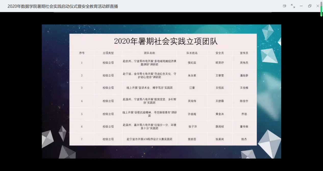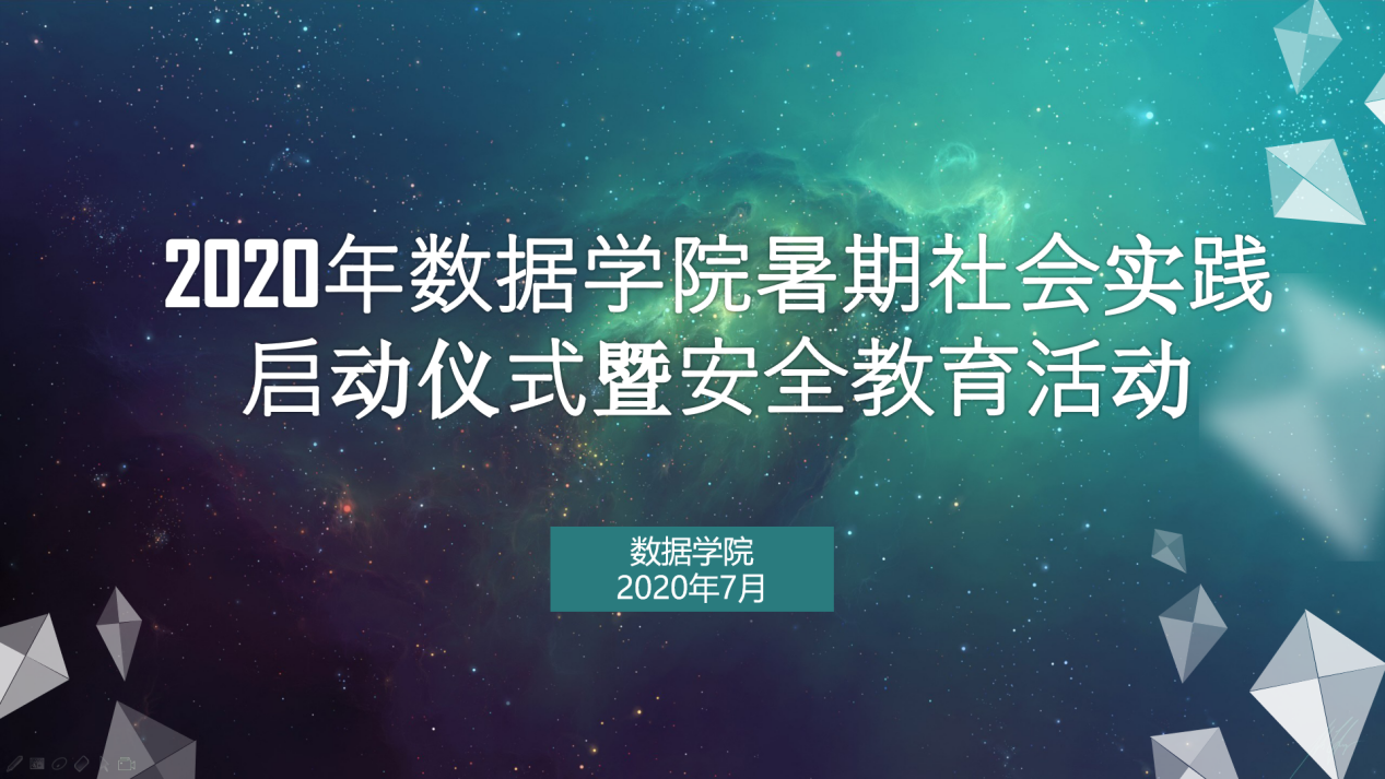 数据学院于7月13日晚上在钉钉平台举行暑期社会实践安全教育暨启动仪式。出席本次会议的有学院党委副书记汪洪老师、学工办老师、团学组织学生干部以及2020年暑期社会实践团队全体成员。