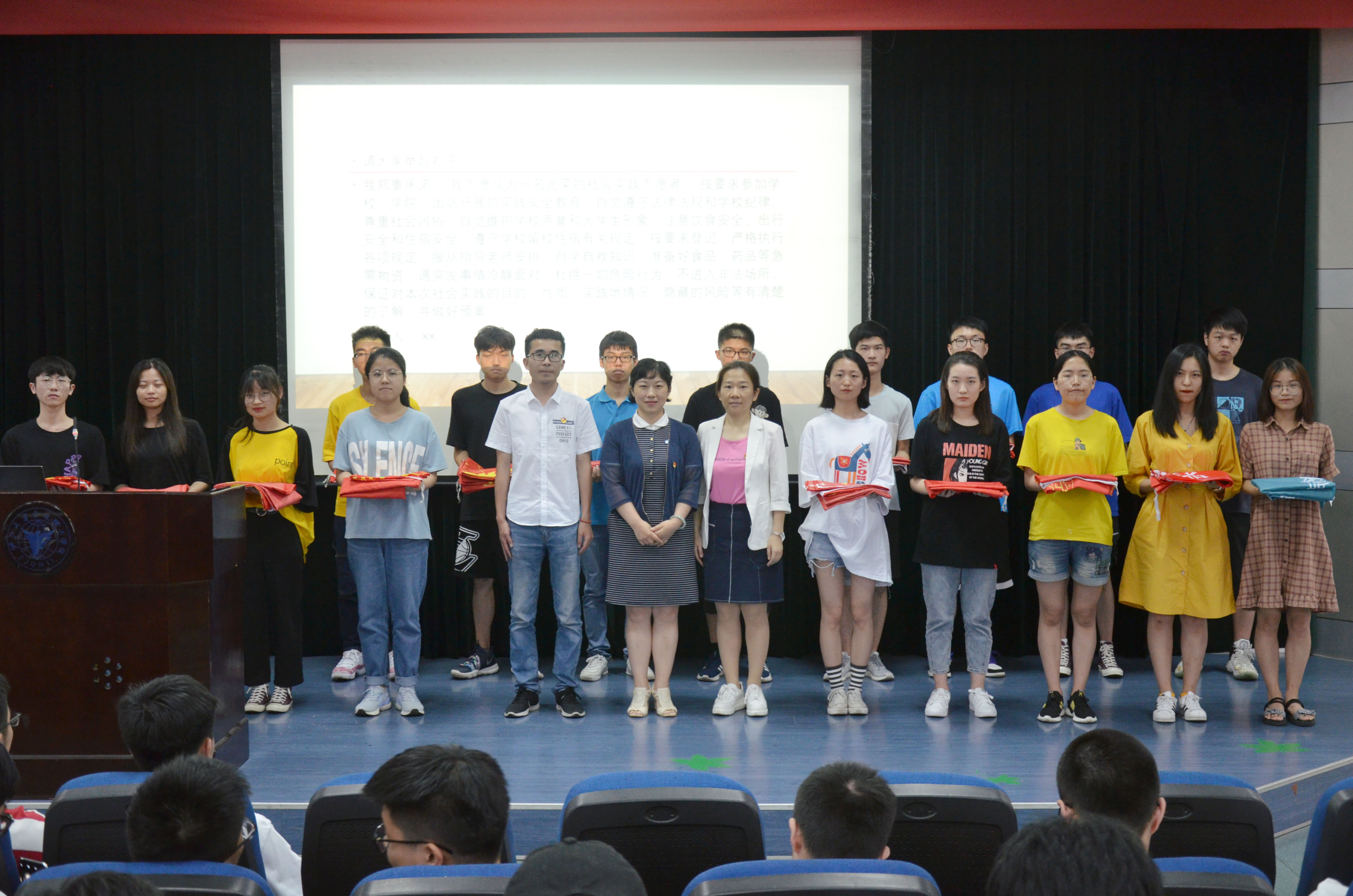 党委副书记汪洪老师为各队长授旗、合影并发表讲话,她指出暑期社会实践的重要性,希望同学们积极投身实践、发挥主观能动、圆满完成任务,同时要把安全始终放在第一位,要铭记于心、体现于行。最后,学院团委书记马炜栋老师开展了安全教育,提醒同学们注意人身安全和财产安全,做好行前安全预案和日常安全信息上报。他预祝同学们在实践中收获喜悦、得到成长。