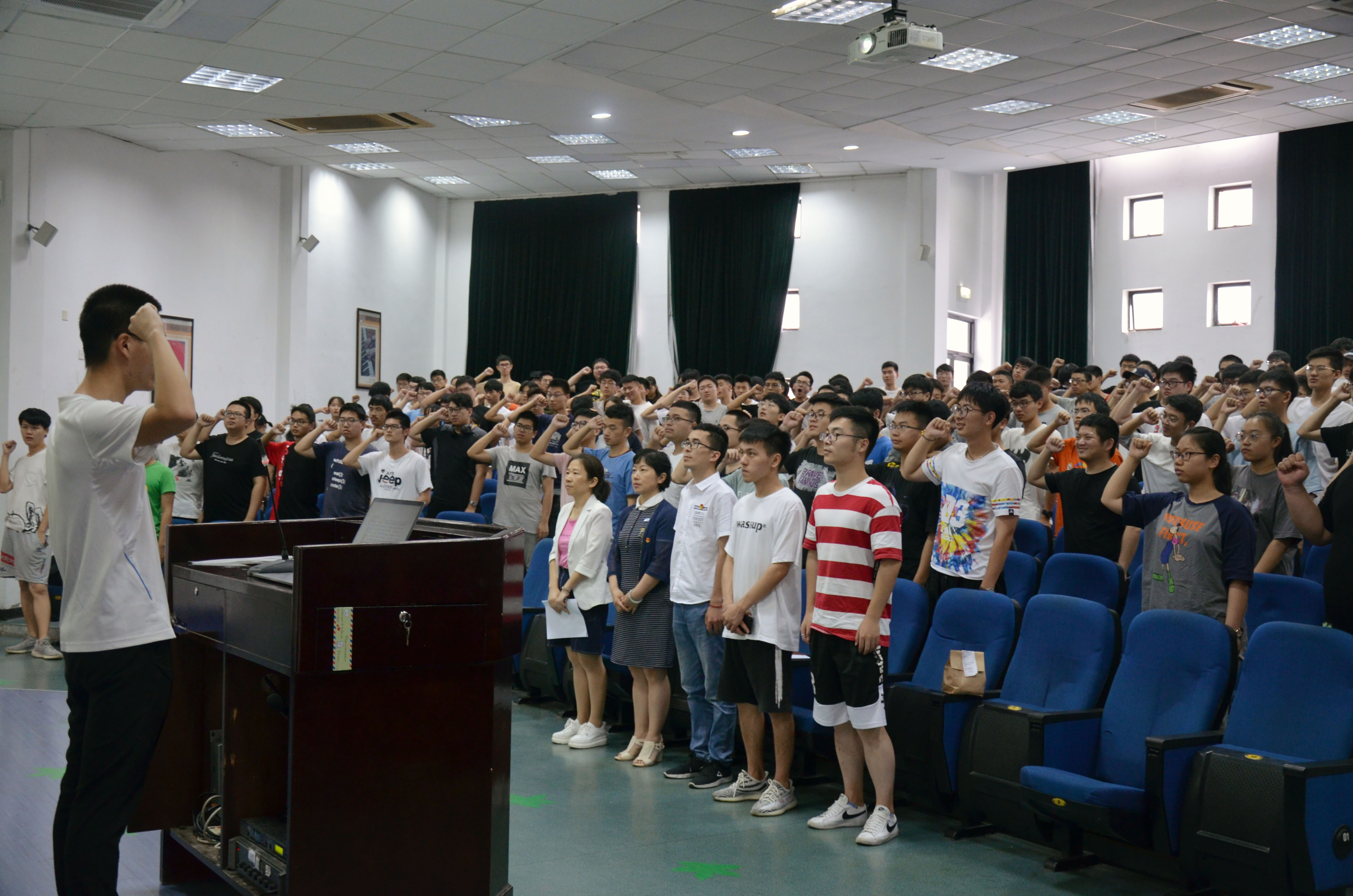马老师首先介绍了出席领导和参会人员,团委副书记陈森杨宣读2019年数据学院暑期社会实践团队名称、队长、安全员和宣传员,今年学院共产生18支暑期社会实践队伍,共计294人参与。新闻中心邓浩然同学讲解了活动新闻稿的撰写格式及注意事项,实践部副部长潘明杰带领全体队员进行暑期社会实践宣誓。