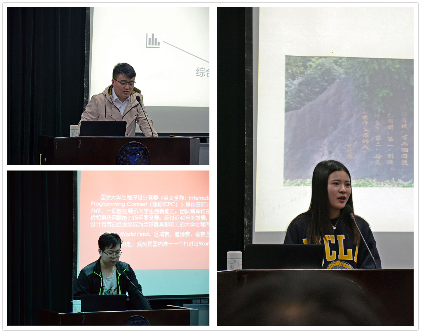 开幕式上,廖海鹏老师和陈根浪老师分别进行了讲话。廖海鹏老师深情回顾了自己曾在学院工作的经历,见证了学院ACM队取得的骄人成绩,并指出本次竞赛月活动的开展将会进一步推动学院创新创业和学科竞赛工作。同时,他对同学们提出三点建议:一是坚持正确的努力方向,二是坚定正确的价值导向,三是学思结合、善于创新。陈根浪老师对本次活动的原因和意义进行说明,强调数据学子必须要有扎实的编程基本功,激励数据学子敢闯敢拼、奋发有为,要注重创新创业能力的培养和实践能力的提升。会议还安排了信计162虞楚婷、信计161章宗沈和计算机172张逸凡三名同学上台。他们分别就大学生科研创新项目、数学建模竞赛、程序设计大赛等做了介绍,并分享了经验体会。