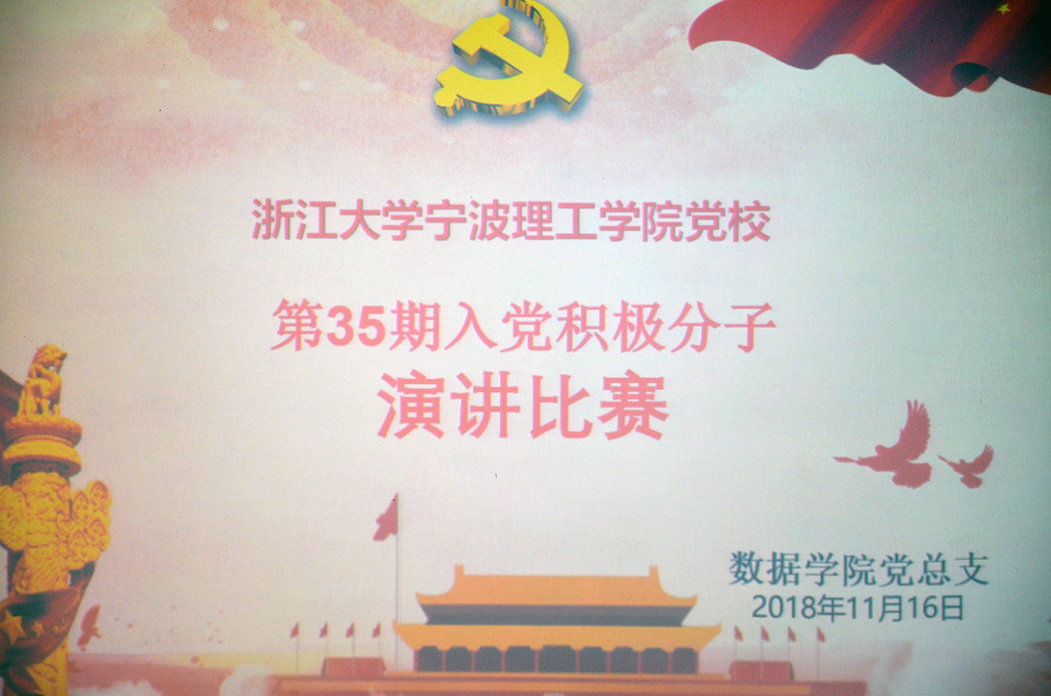 11月16日15:30,数据学院党总支在石麟602举行了第35期入党积极分子演讲比赛。本次比赛由计算机161班金国强同学主持,第35期党校数据学院全体学员参加。