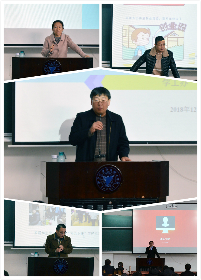 述职会上,学工办的老师们分别进行了辅导员述职报告。首先由王常青老师开始,她从班导师工作、安全稳定工作、其他工作和不足之处四个方面进行了述职报告,简要介绍了一年以来的工作情况。接着,邬旭东老师从“关于我们”、“做些什么”、“未来如何”三个角度进行工作总结。陈辉老师则介绍了其在过去一年中在支部工作、学生组织工作、学风建设工作等方面所取得的成果。最后,马炜栋老师从团学组织、公寓管理、学生谈话、评奖评优等方面,总结了入职以来的工作情况。述职过后,学生们给辅导员老师们进行了打分。