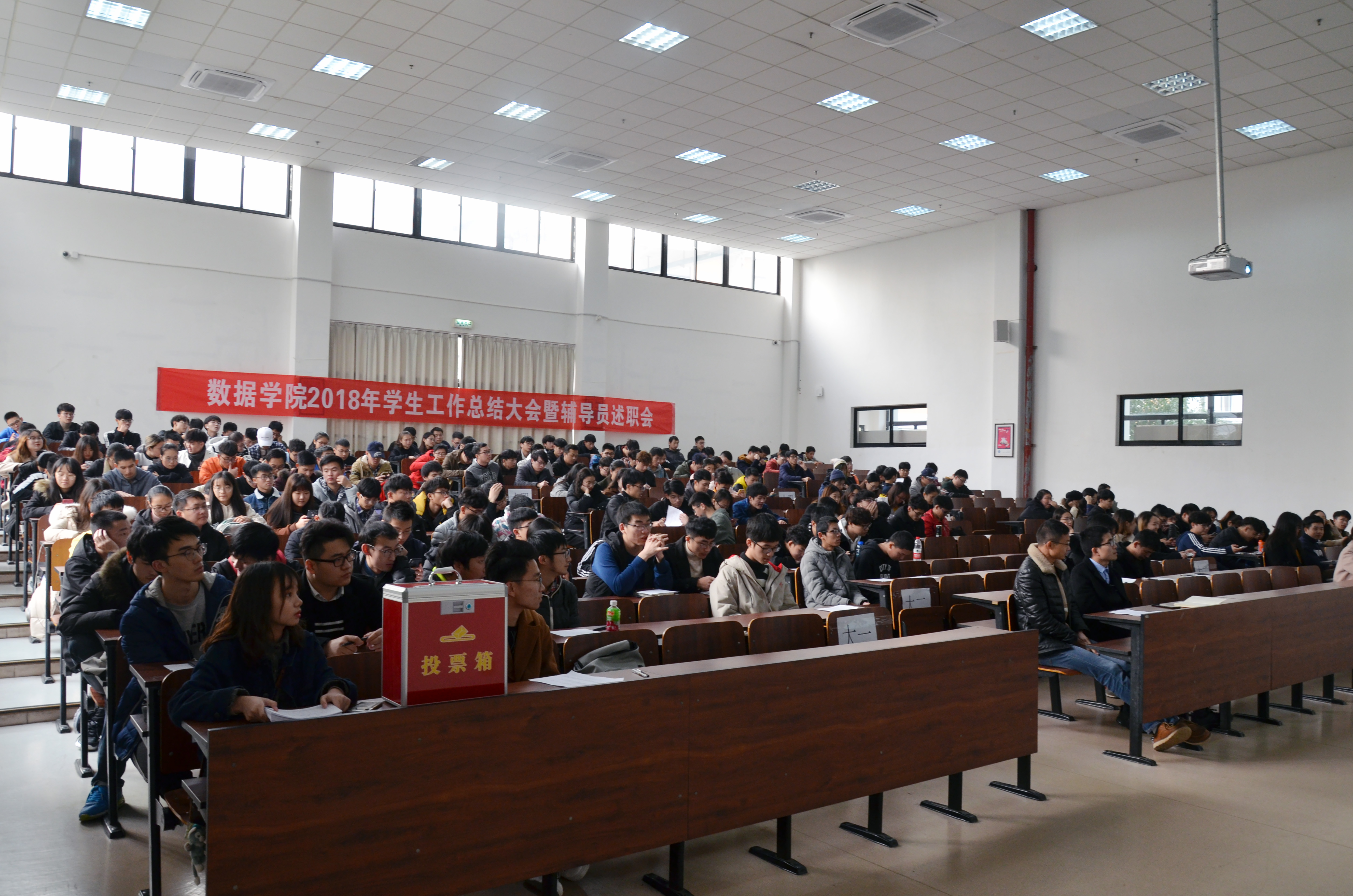 2018年12月21日15时30分,数据学院在NC102举行了2018年学生工作总结大会暨辅导员述职会。出席本次会议的有数据学院党总支副书记于欣老师、学工办辅导员王常青老师、邬旭东老师、陈辉老师和马炜栋老师,各班级学生代表也参加了本次大会。