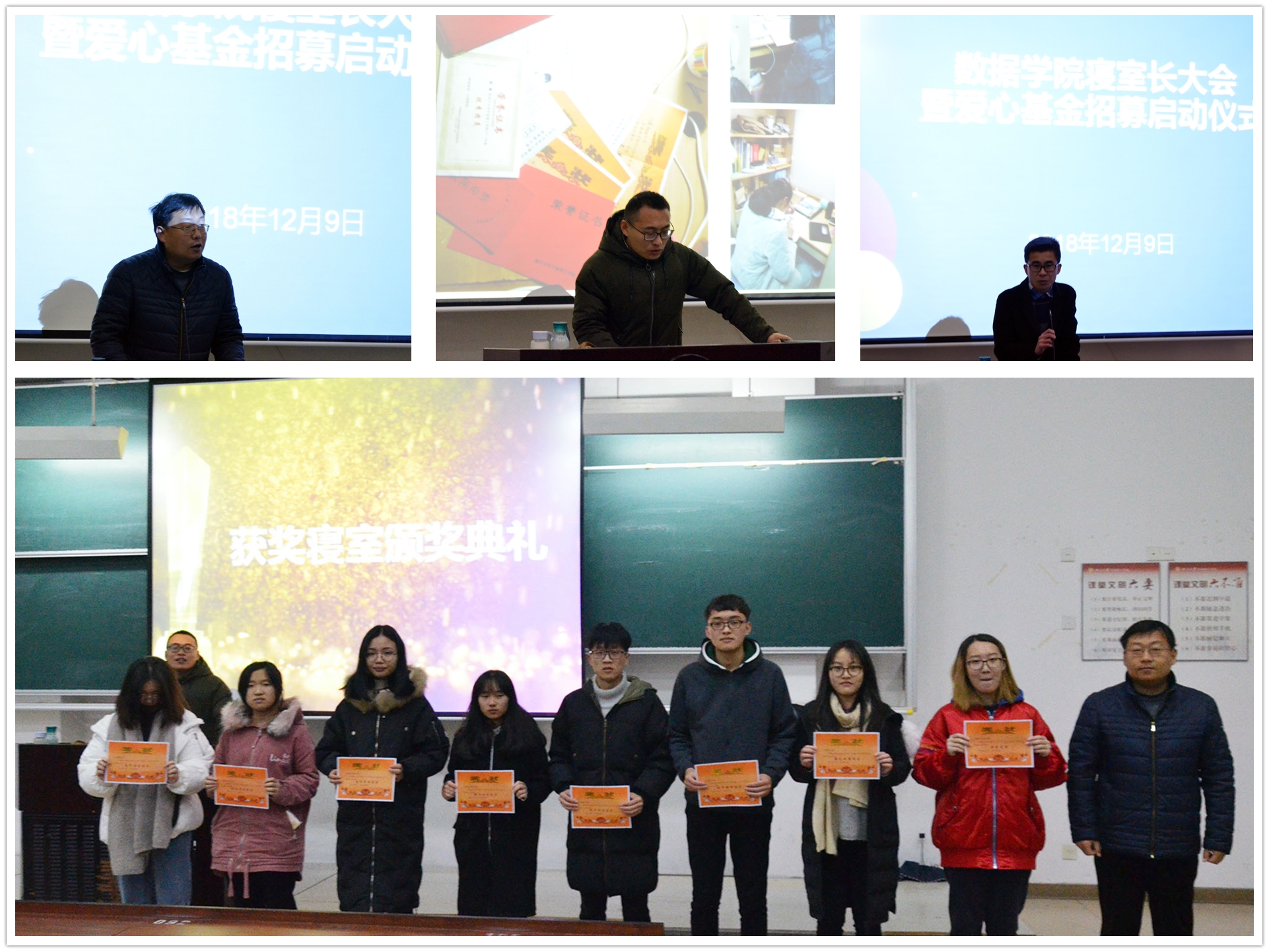 12月9日18:30,在NC101教室,数据学院开展了寝室长大会暨爱心基金募集启动仪式。寝室长大会由数据学院学工办马炜栋老师主持,数据学院党总支副书记于欣老师,思政主管王常青老师,学工办陈辉老师出席,数据学院全体寝室长参加了本次大会。