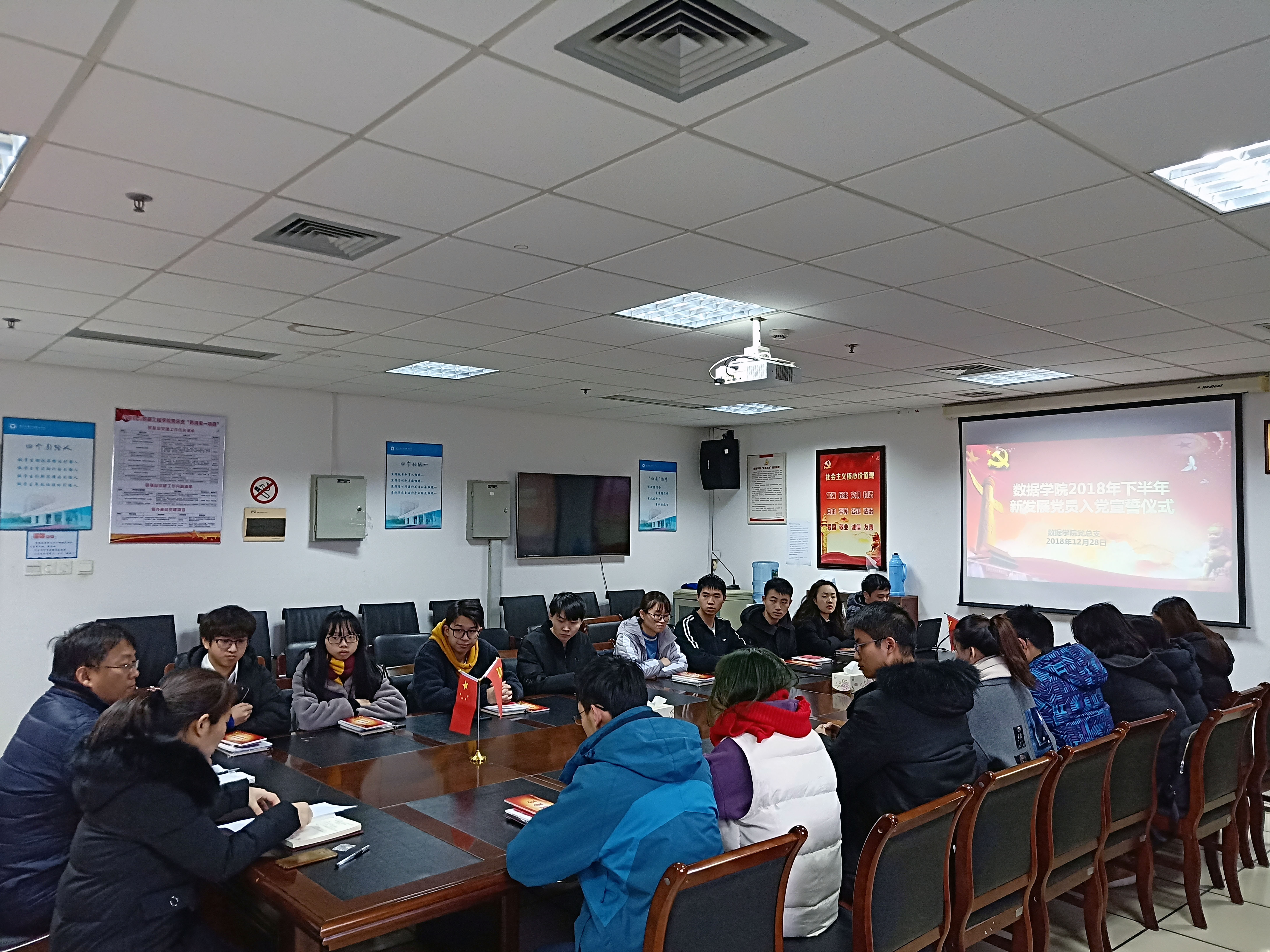 2018年12月28日下午数据学院在石麟602党员之家举行新发展党员入党宣誓仪式。本次会议由数据学院党总支组织委员、思政主管王常青老师主持,学院党总支副书记于欣老师出席,2018年下半年全体新发展党员参加。