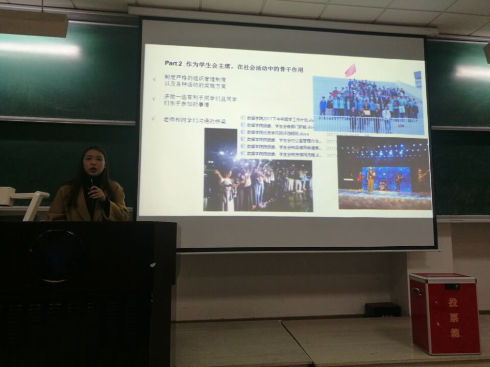 数据学院党总支于12月27日晚在NF101举行了第二届“最美学生党员”评选活动,学院党总支书记方国娟、思政主管王常青、团委书记陈辉和全体党员及学生代表参加了活动。本次活动由第一届“最美学生党员”、学校“十佳大学生”和宁波市“优秀大学生”获得者鲍东同学主持。