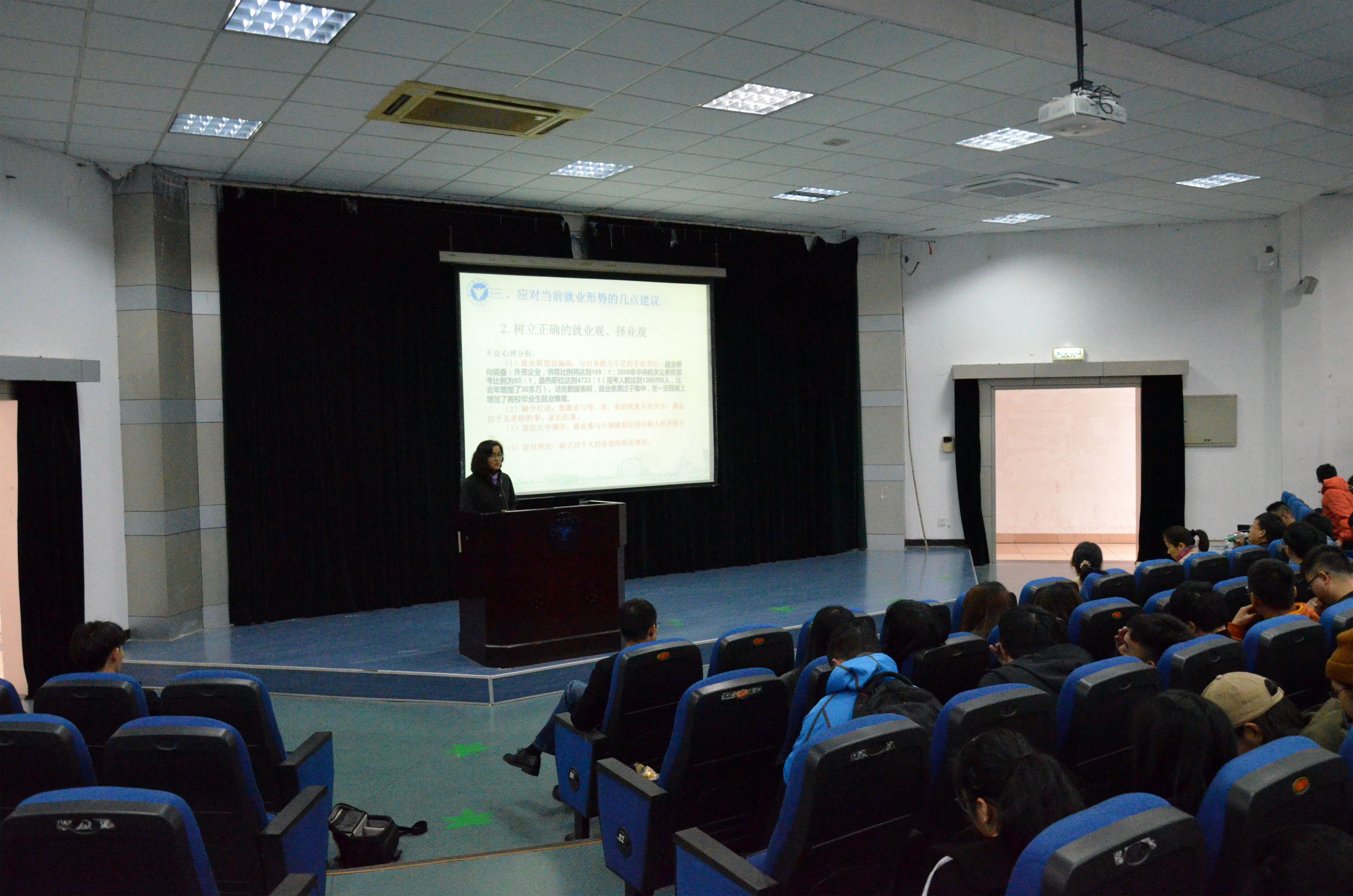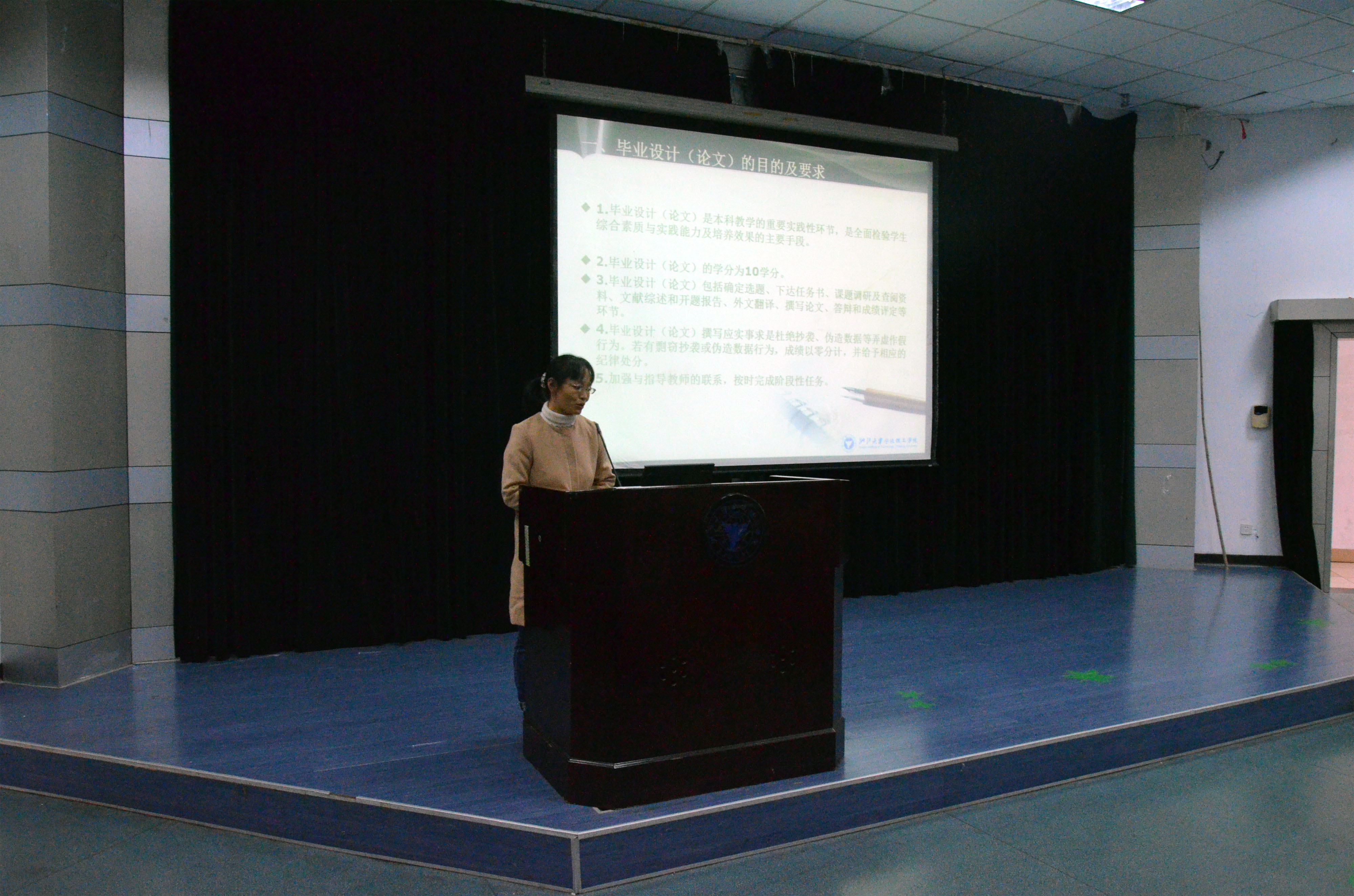 教务办李书芹老师向毕业生介绍了毕业设计的要求和注意事项,也提醒了学分还未修满的学生注意重修。邬旭东老师向大家详细讲解了宁波市的就业政策和学院就业指导与服务工作的安排。