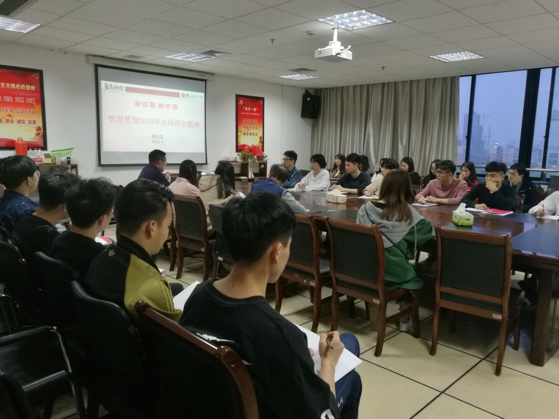 4月12日18:00,数据学院党总支在石麟大楼602党员之家举行了学习贯彻2018年全国两会精神专题辅导讲座。讲座由学院思政主管王常青主持,传媒学院陈印昌老师主讲,全体学生预备党员参加。