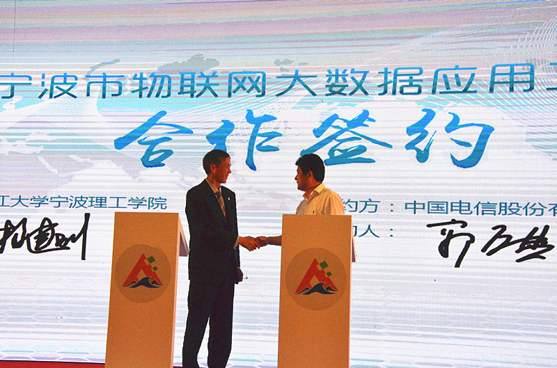 我校杨建刚副院长代表学校和中国电信股份有限公司宁波分公司总经理郭百其就共建宁波市物联网大数据应用工程中心进行合作签约,合作内容包括大数据领域高端企业人才培训、智能制造和大数据项目合作、NB-IoT窄带物联网应用技术研究、人才培养和实验室共建等。