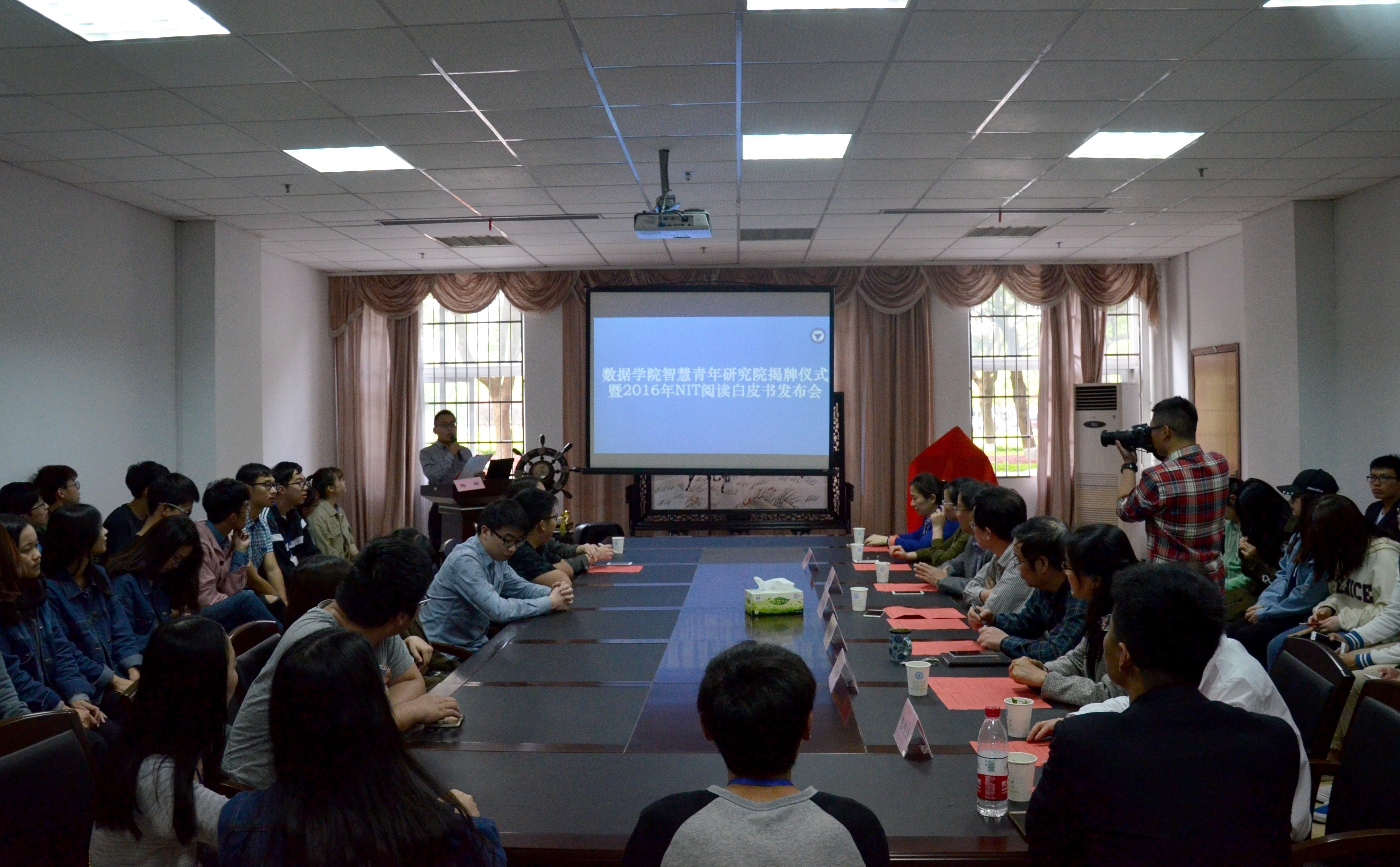 2017年4月23日下午,数据学院智慧青年研究院揭牌仪式暨2016年NIT阅读白皮书发布会在校图书馆一楼会议室举行。参加活动的有数据学院院长庞超逸老师、图书馆馆长赵继海老师、数据学院党总支书记方国娟老师、信息中心主任郭建康老师、教务处副处长江美芬老师、数据学院副院长陈根浪老师、数据学院思政主管王常青老师、图书馆副主管刘杰老师以及数据学院学生组织学生干部和学生代表。团委书记陈辉老师主持会议。