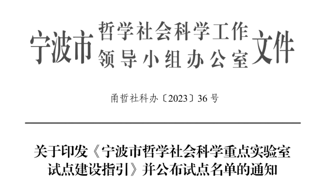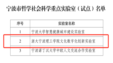近日,宁波市哲学社会科学工作领导小组办公室下发了《关于印发<宁波市哲学社会科学重点实验室试点建设指引>并公布试点名单的通知》。全市共有3个实验室获批,其中我校“浙大宁波理工学院文化数字化创新实验室”获批宁波市哲学社会科学重点实验室(试点)。