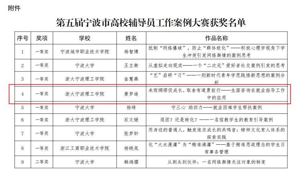 其中我院黄梦迪老师撰写的《未雨绸缪促成长,取舍有道勇前行——生涯咨询在就业指导工作中的应用》荣获一等奖的案例。