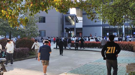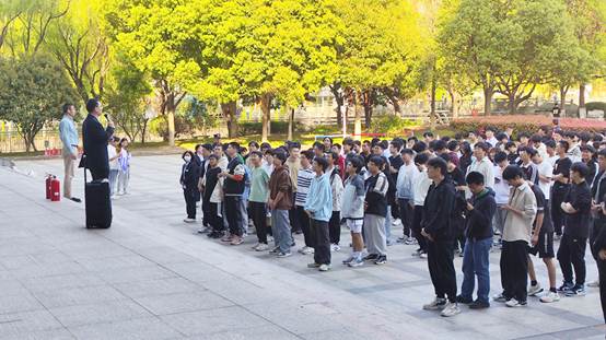随着现场警报的响起,应急疏散预案启动,老师同学们在工作人员的引导下,从消防通道迅速、有序、安全地撤离模拟火灾发生现场,前往可珍讲堂前面集结点集合。