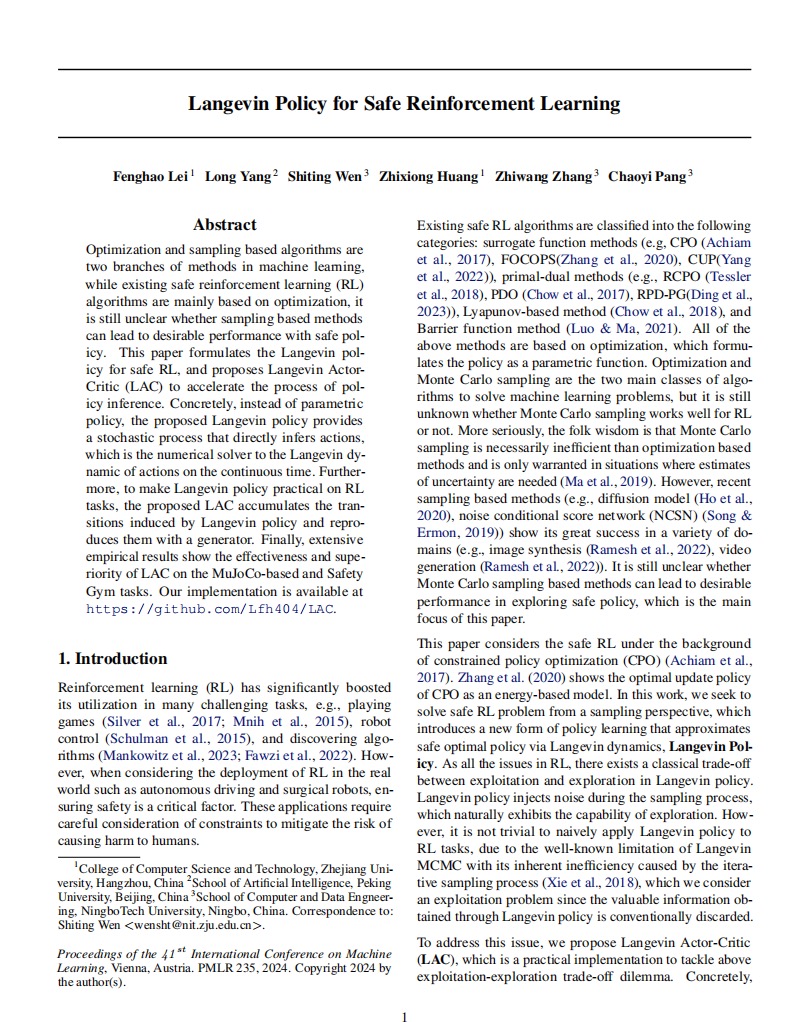 近日,第41届国际机器学习大会ICML(International Conference on Machine Learning)公布2024年论文最终录用结果。浙大宁波理工学院计算机与数据工程学院联培研究生雷丰豪(导师文世挺教授)为第一作者的论文“Langevin Policy for Safe Reinforcement Learning”被大会接收。作为机器学习领域的顶级国际会议之一,国际机器学习大会ICML在计算机科学领域享有崇高的声望,被公认为是人工智能、机器学习领域难度最高的国际会议之一。因其论文录用标准及其严苛,ICML受到中国计算机学会CCF高度推荐并列为A类会议。本届大会在奥地利维也纳召开,在本届大会共收到投稿量9473篇,录用2609篇,论文采用双盲评审机制,录用率仅27.5%。论文第一作者是我校22级计算机技术专业浙大联培硕士研究生雷丰豪,通信作者为我校数据学院文世挺教授。