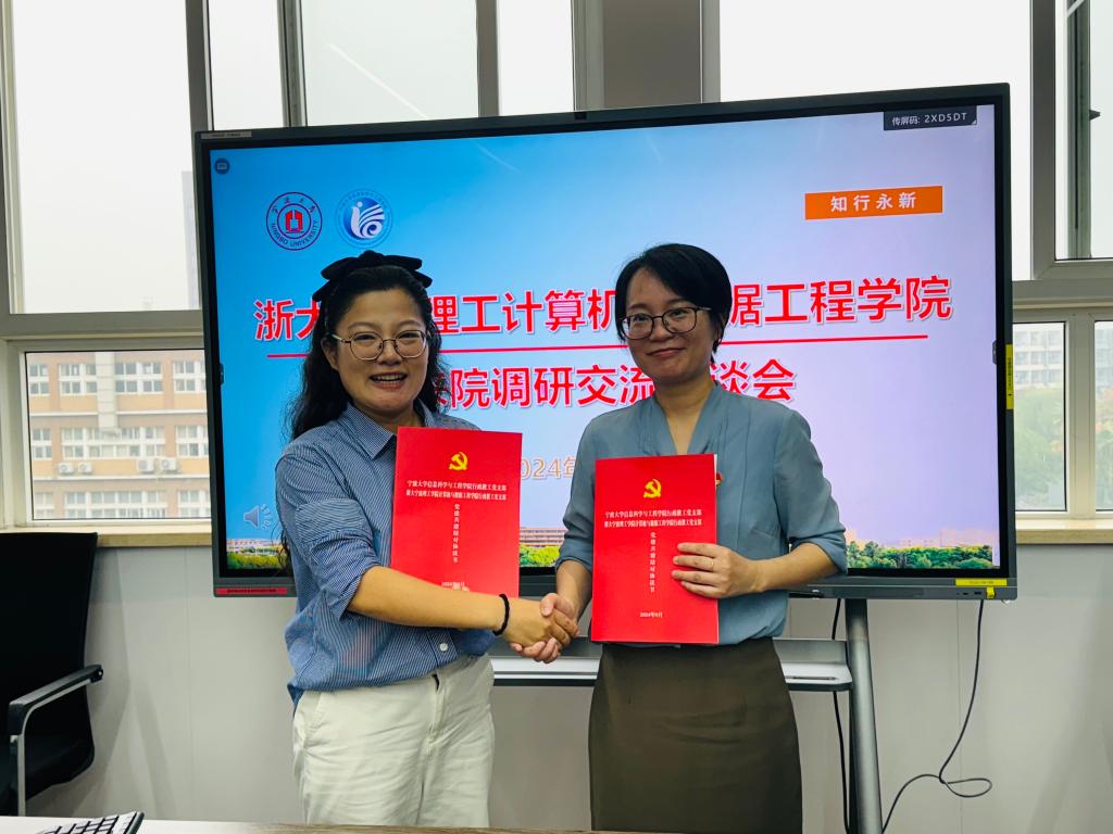 双方先开展了座谈交流。宁波大学信息科学与工程学院党委书记王伦耀介绍了学院建设情况,并重点展示了全国党建工作标杆院系的创建工作成果。党委副书记李洁介绍了学生创新创业工作情况。计算机与数据工程学院党委书记于欣介绍了我院发展历程、人才培养、党建工作等情况。随后双方就全国标杆院系建设、教育教学、人才培养、学生学科竞赛管理、双创、就业等相关工作进行了深入交流。会议最后,两院行政教工党支部进行了党建联建结对仪式,双方支部将秉承立德树人的教育初心,加强学习交流,提升管理服务师生水平。