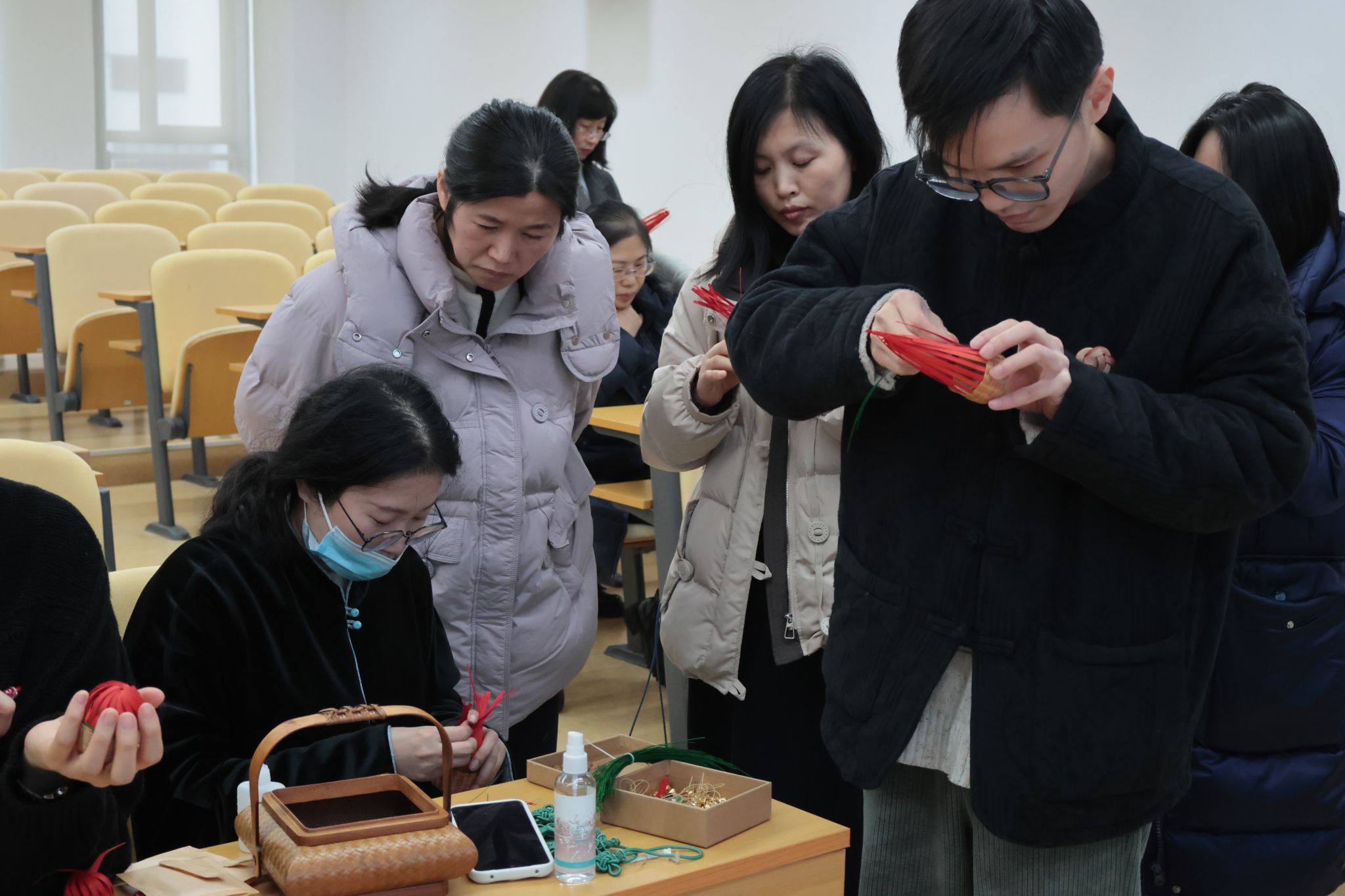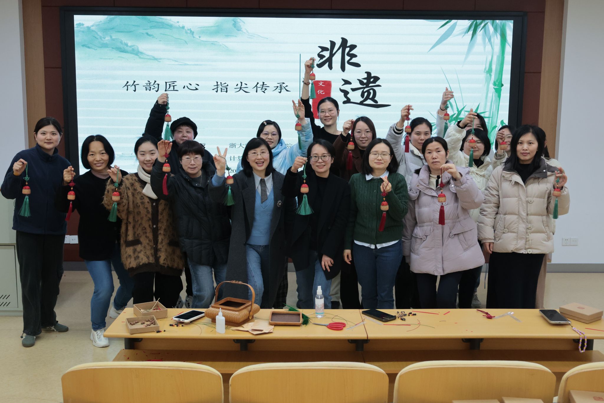 活动开始,竹编传承人叶商杰向数据学院的全体女教师介绍了宁波鄞州竹编的历史渊源、文化价值以及制作工艺,在现场亲自示范竹编制作的工艺技巧,让大家对这门非遗技艺有了更直观的认识。到了实际编织环节,女教职工们遇到不少难题。竹丝柔韧性难以把握,编织纹路也不易成型。面对这些挑战,大家相互鼓励,彼此交流经验,逐步突破困境。随着时间的推移,一个个独具匠心的竹编作品在她们手中逐渐成型,活动现场不时传出欢声笑语,气氛十分融洽。