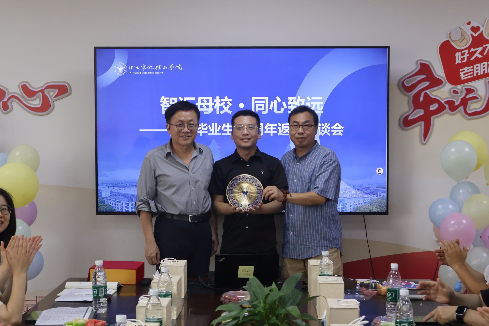 座谈会上,涂黎晖副院长系统介绍了学院发展现状,生动阐释了“两个数据学院”发展理念。近年来,学院紧密对接宁波“港产城文”数字化战略,在智能物流、数字文化等领域取得突破性进展。他特别强调:“校友是学院发展的活水之源,期待以校友为纽带,构建产学研协同创新的数据生态链。”活动现场,2014级信管专业米嘉成校友代表杭州校友会向学院赠送了纪念盘。
