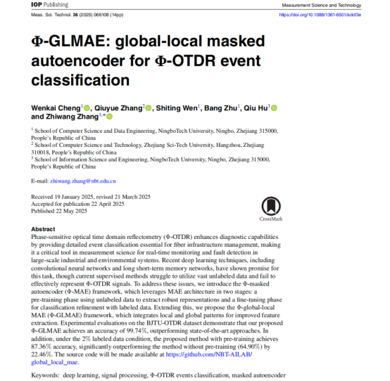 近日,我院计算机科学与技术226班程文恺作为第一作者、张志望老师作为唯一通讯作者、文世挺老师作为指导老师的的研究论文《Φ-GLMAO: global-local masked autoencoder for Φ-OTDR event classification》在国际期刊《Measurement Science and Technology》正式发表。该期刊位列JCR Q1区,并入选ZJU Top期刊名录,代表相关领域的先进科研水平。